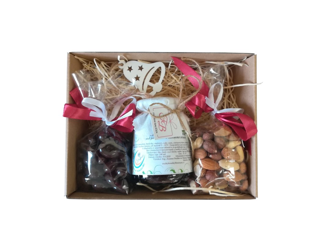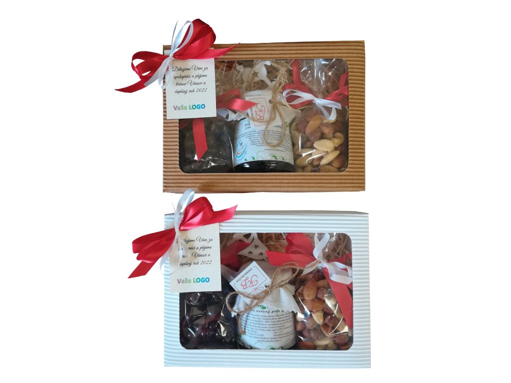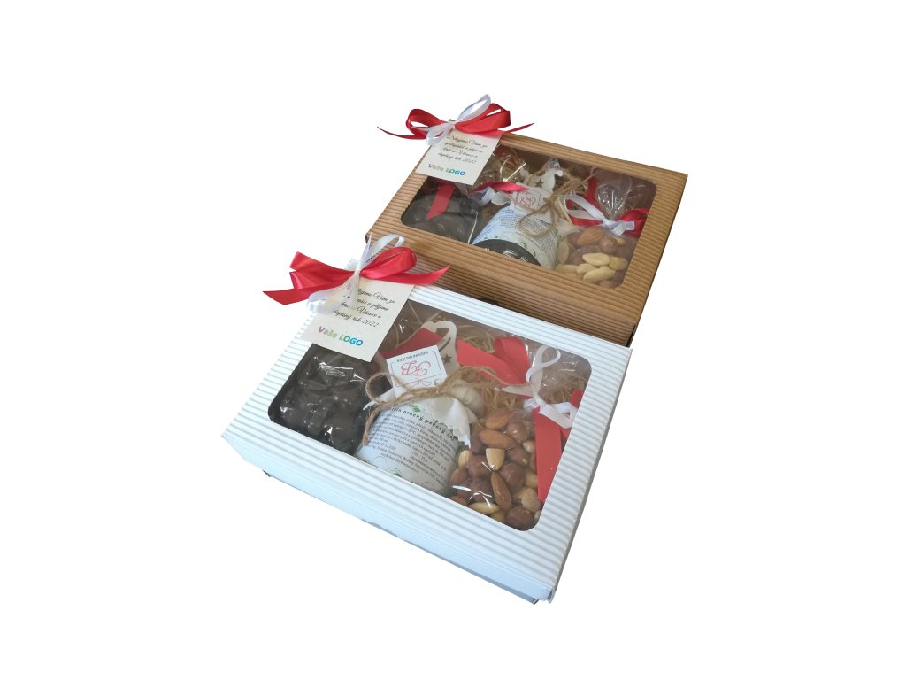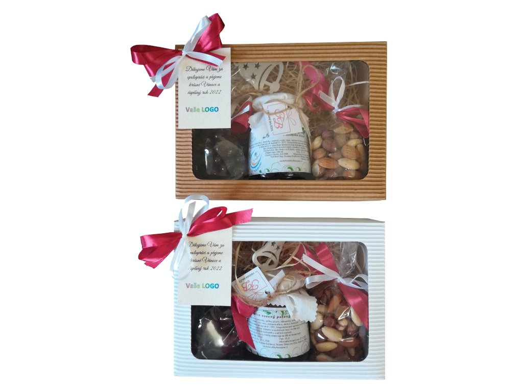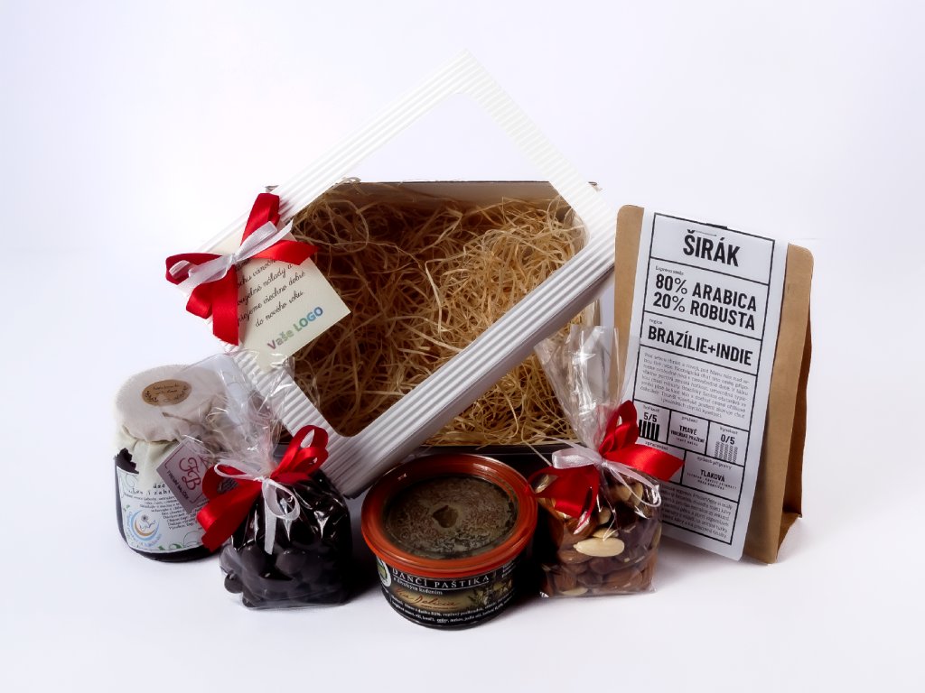 Vyberte si sami 3 dobroty do balíčku: ořechovou směs, brusinky v čokoládě, domácí pečený čaj, lahodný med, čerstvě upraženou kávu nebo premiovou paštiku. Přidáme dřevěnou ozdobu 3-4cm a nakonec komplimentku přáníčkem a firemním logem.