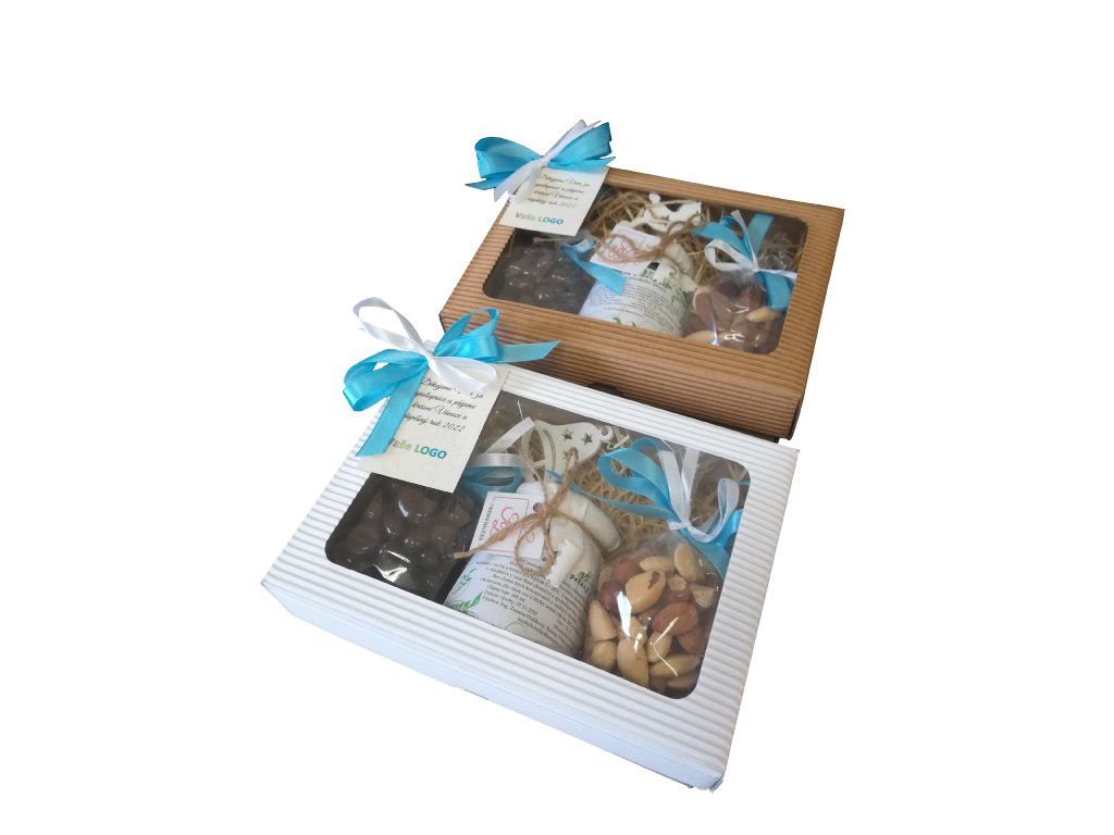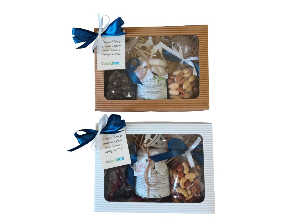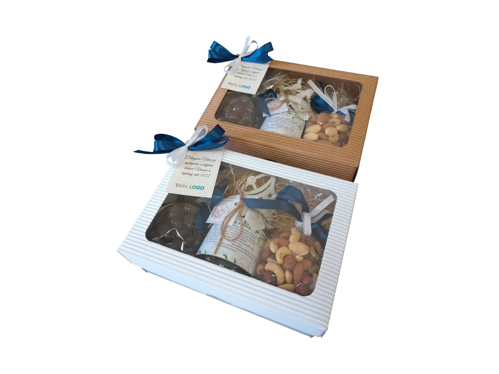Vyberte si sami 3 dobroty do balíčku: ořechovou směs, brusinky v čokoládě, domácí pečený čaj, lahodný med, čerstvě upraženou kávu nebo premiovou paštiku. Přidáme dřevěnou ozdobu 3-4cm a nakonec komplimentku přáníčkem a firemním logem.