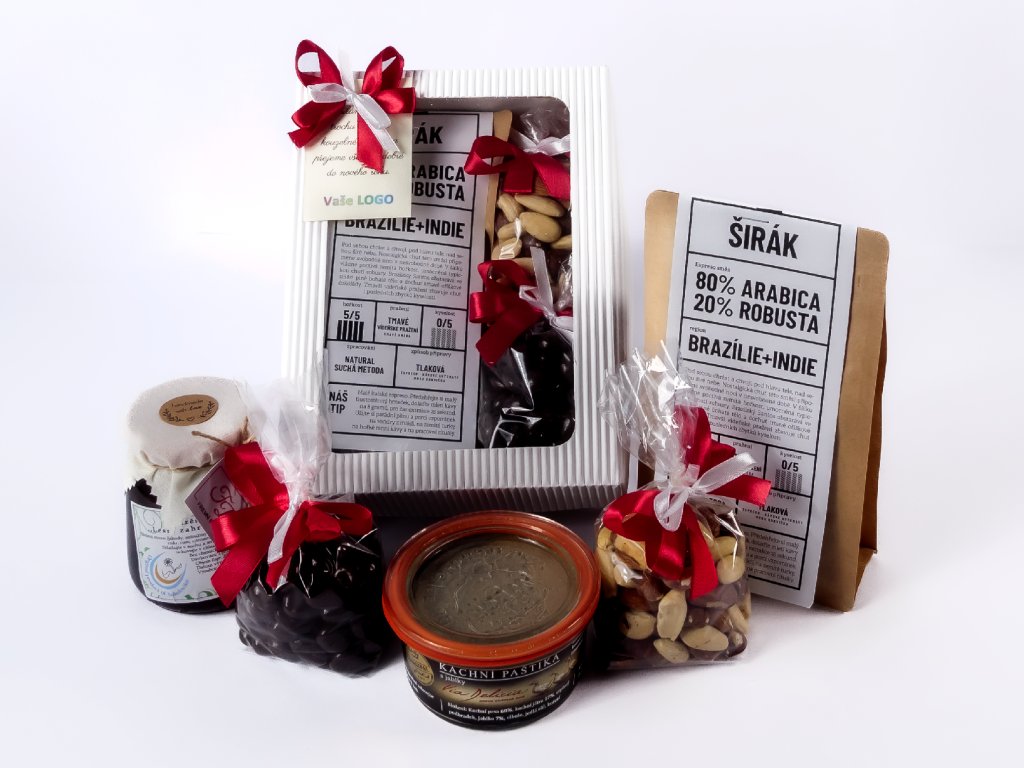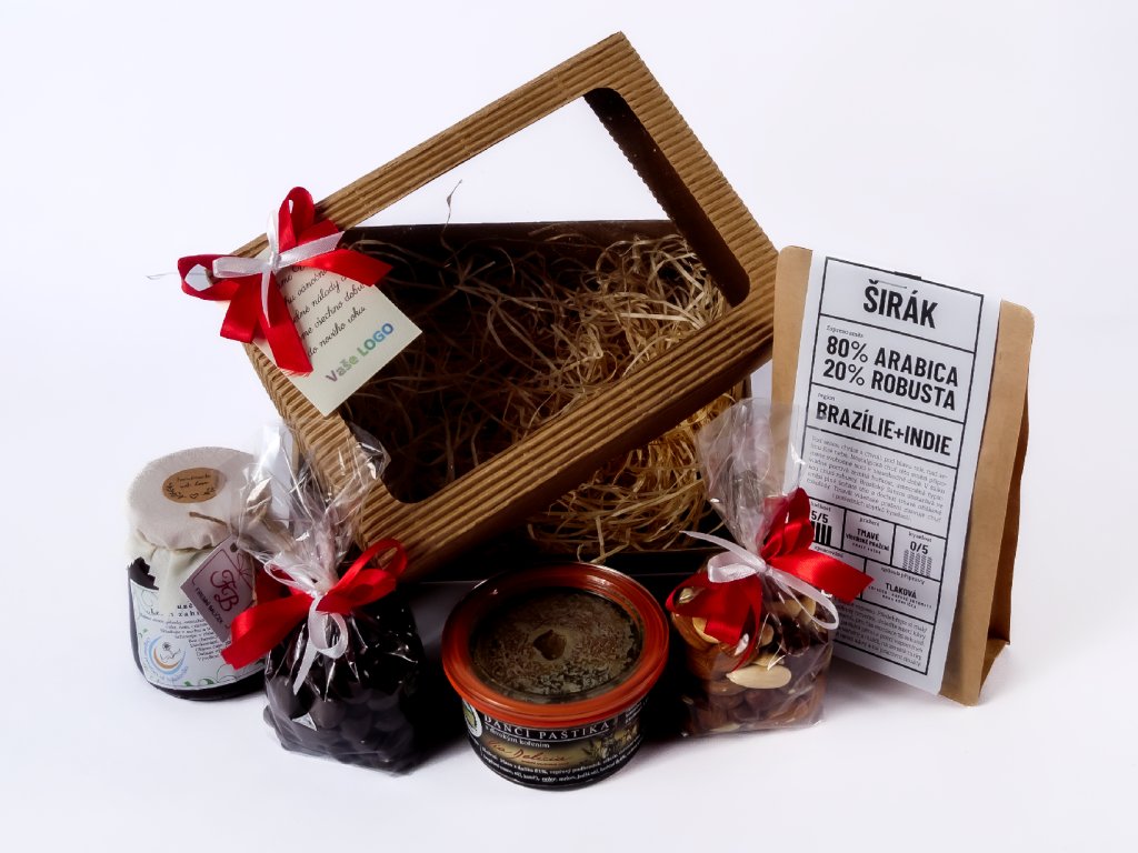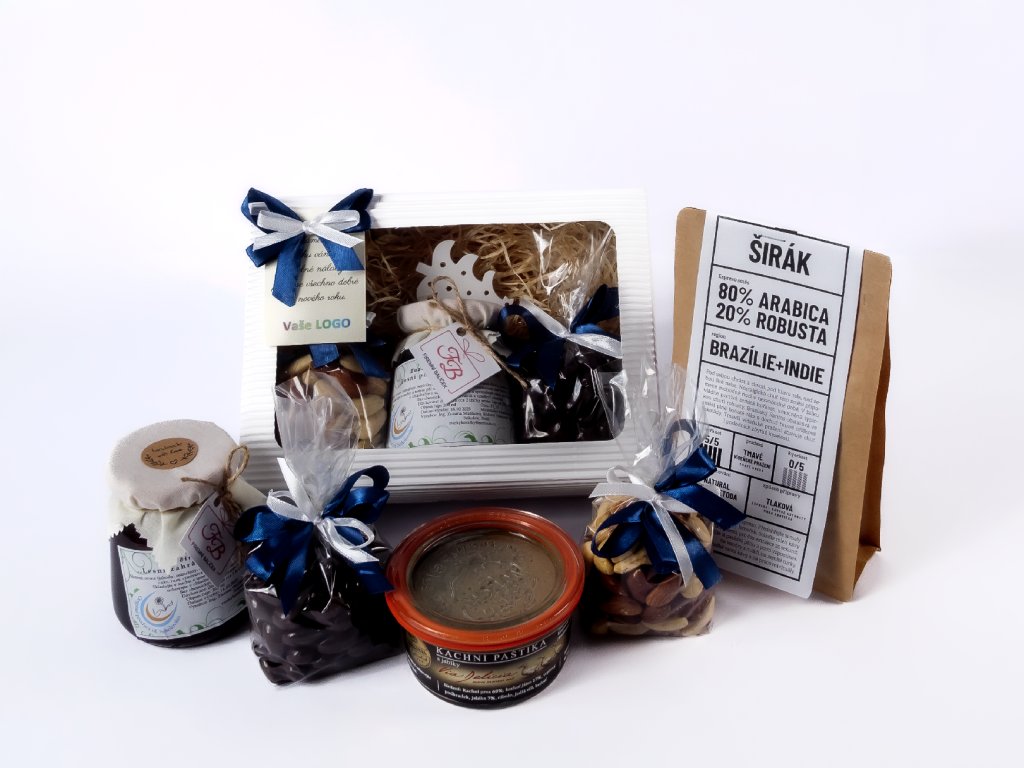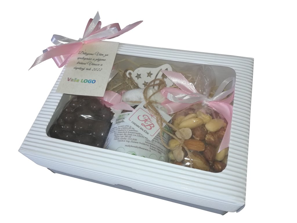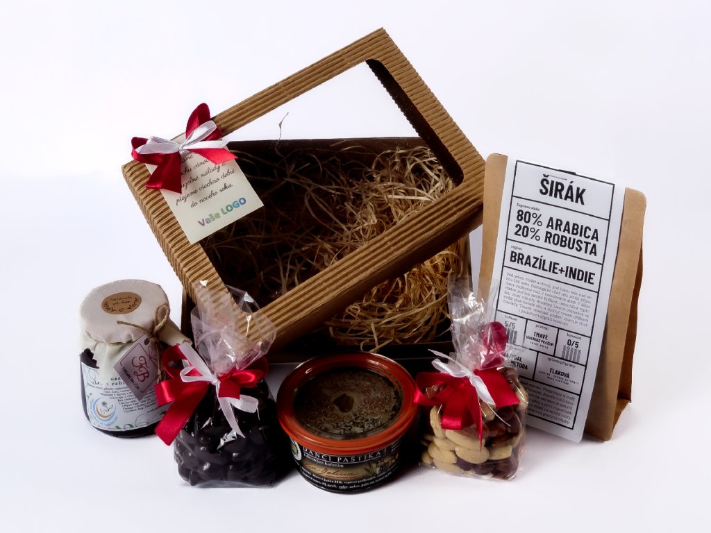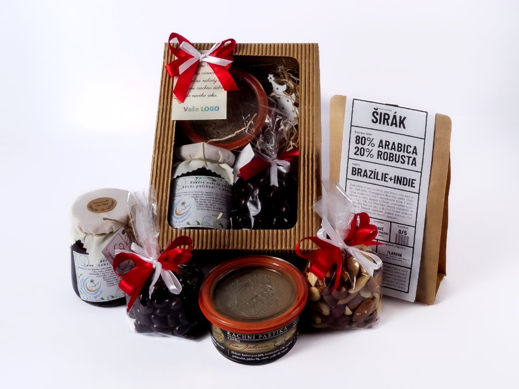 Vyberte si sami 3 dobroty do balíčku: ořechovou směs, brusinky v čokoládě, domácí pečený čaj, lahodný med, čerstvě upraženou kávu nebo premiovou paštiku. Přidáme dřevěnou ozdobu 3-4cm a nakonec komplimentku přáníčkem a firemním logem.