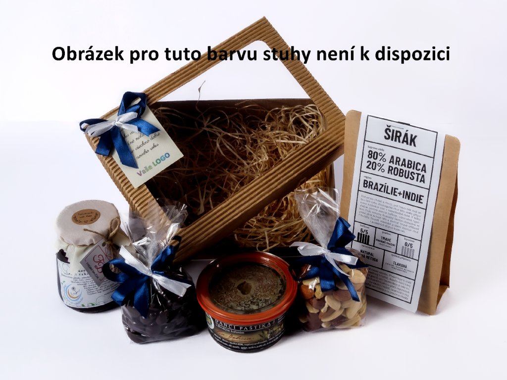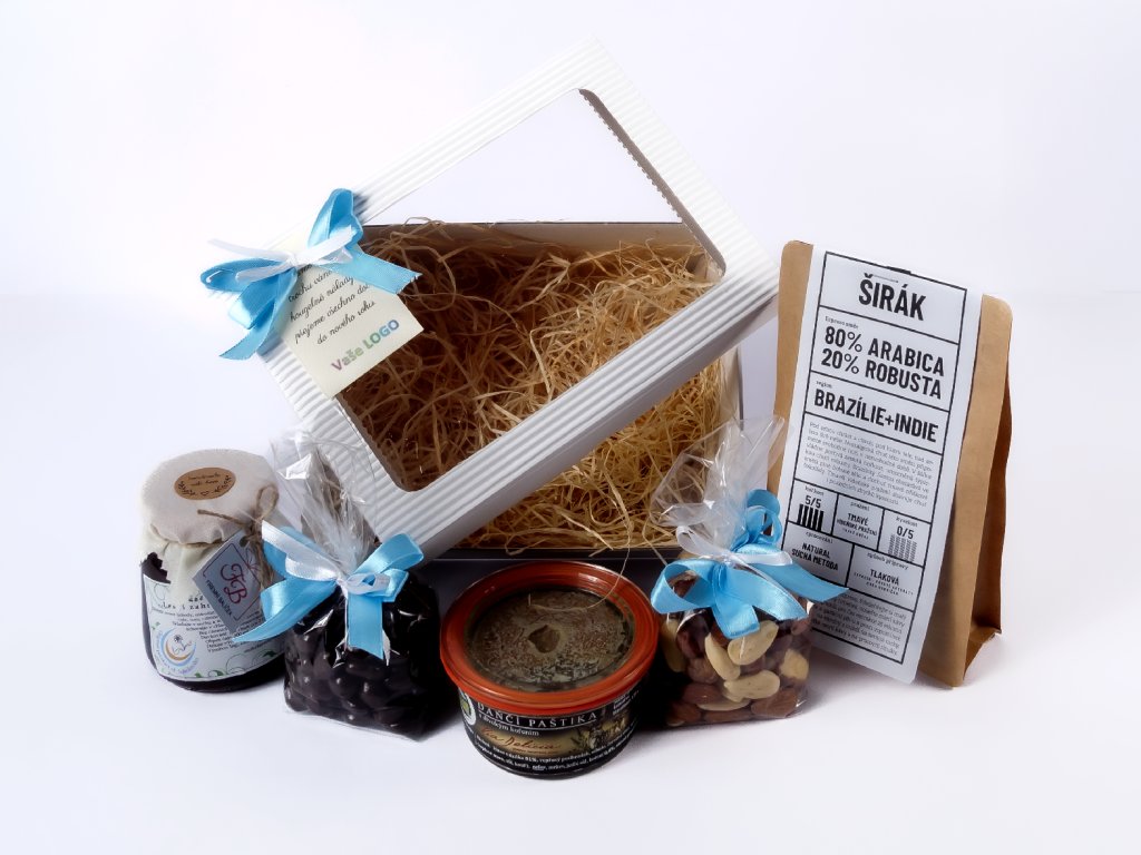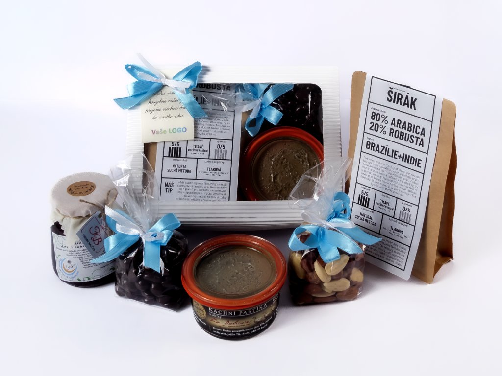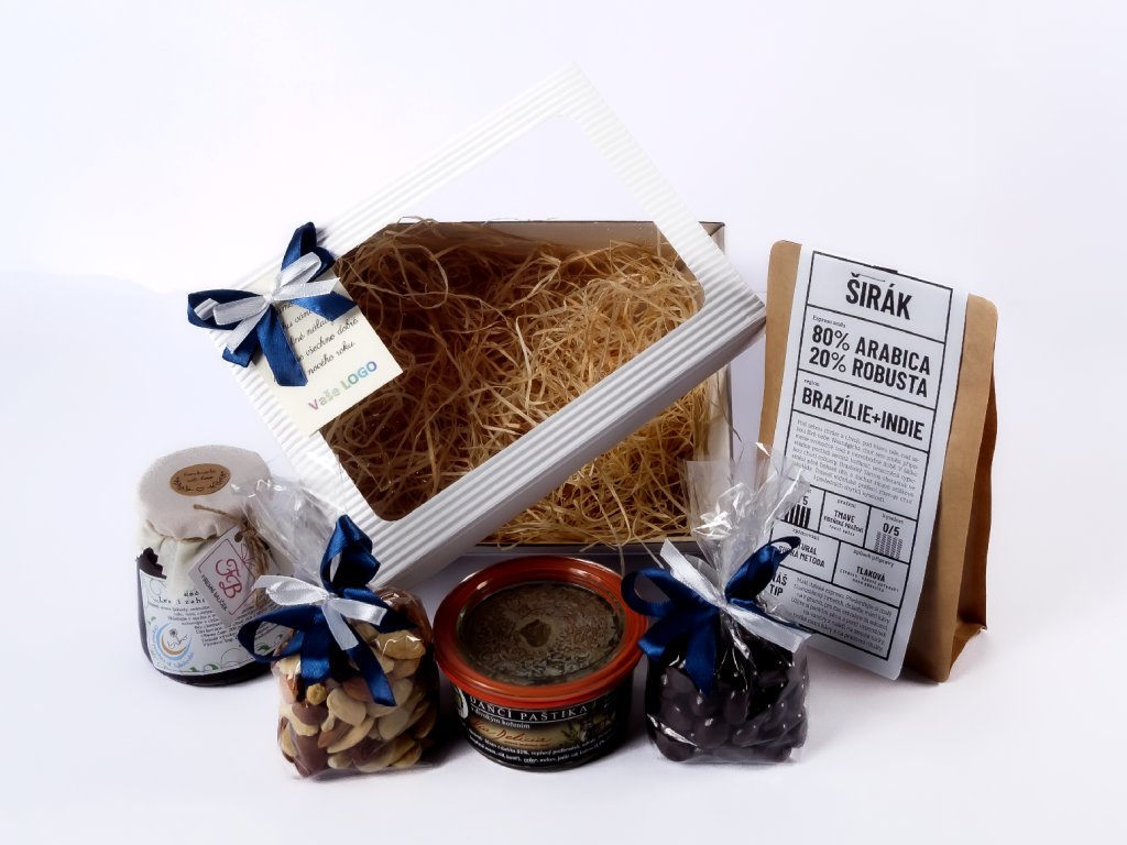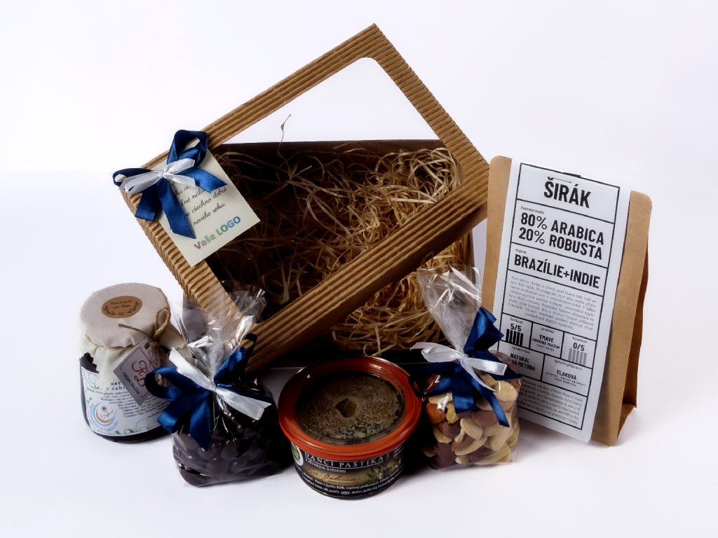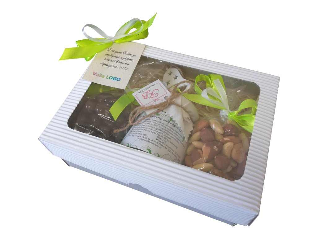 Vyberte si sami 3 dobroty do balíčku: ořechovou směs, brusinky v čokoládě, domácí pečený čaj, lahodný med, čerstvě upraženou kávu nebo premiovou paštiku. Přidáme dřevěnou ozdobu 3-4cm a nakonec komplimentku přáníčkem a firemním logem.