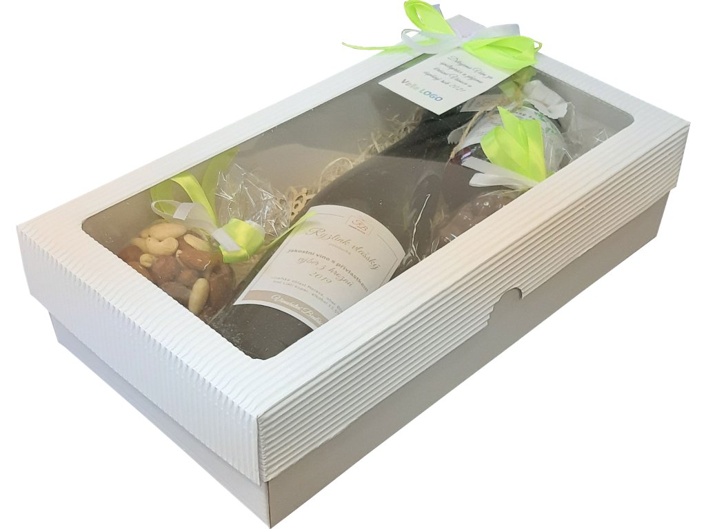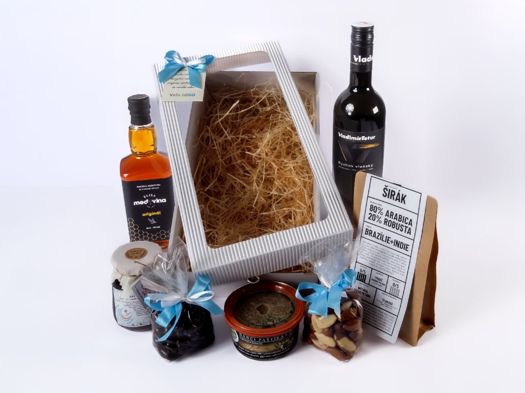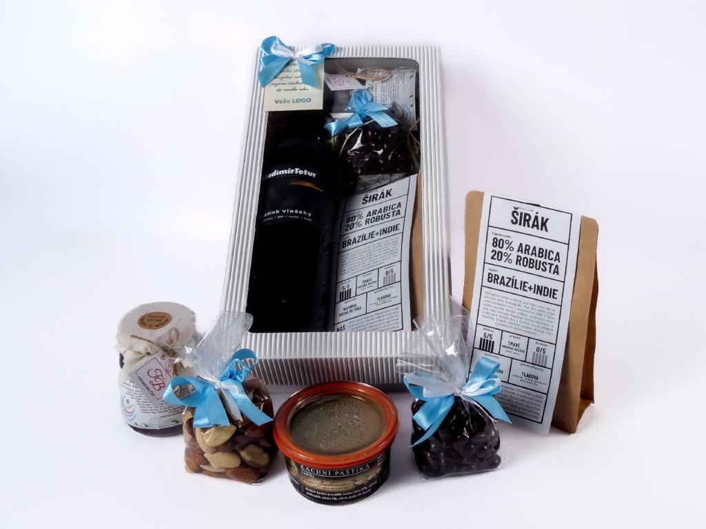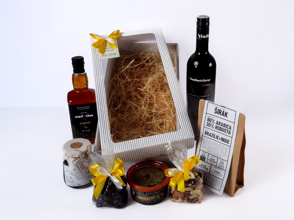 Balíček s lahví (víno, medovina, prosecco nebo bohemia sekt) ke kterým si vyberte 1-3 dobroty: ořechovou směs, brusinky v čokoládě, domácí pečený čaj, lahodný med, čerstvě upraženou kávu nebo premiovou paštiku. Přidáme dřevěnou ozdobu 3-4cm a nakonec komplimentku s přáníčkem a firemním logem.