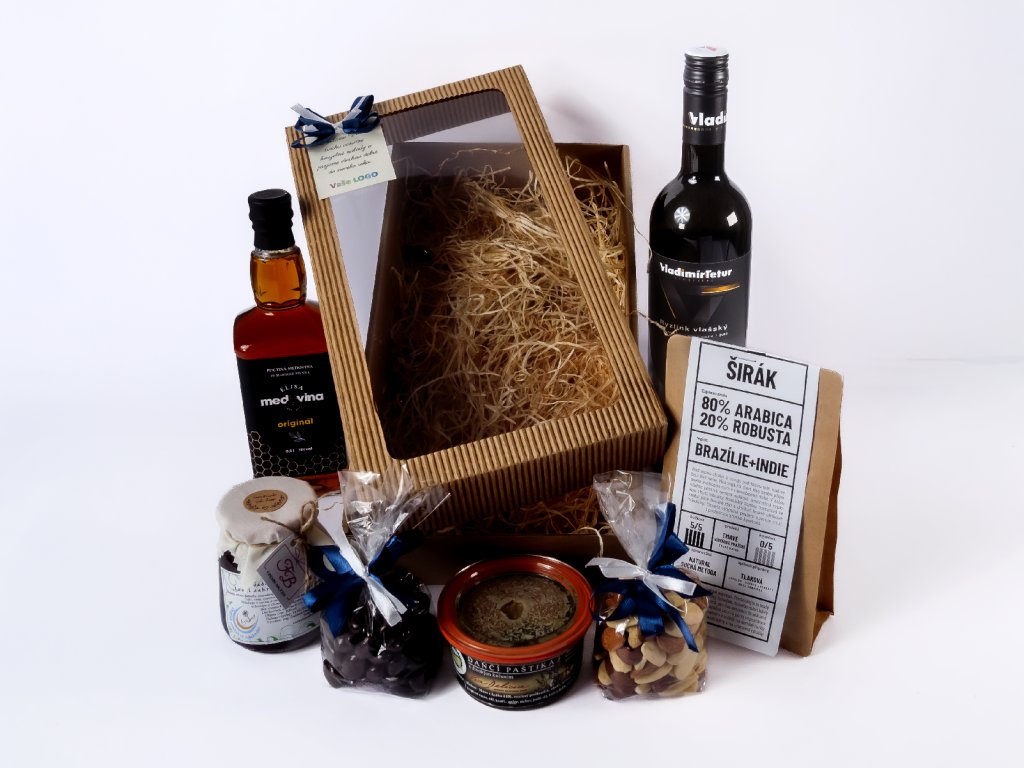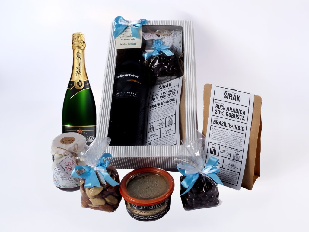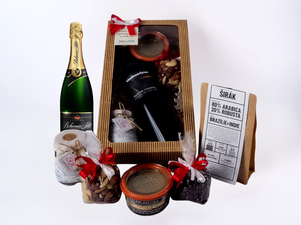 Balíček s Bohemia Sekt demi sec 0,75l ke kterému si vyberte 1-3 dobroty: ořechovou směs, brusinky v čokoládě, domácí pečený čaj, lahodný med, čerstvě upraženou kávu nebo premiovou paštiku. Přidáme dřevěnou ozdobu 3-4cm a nakonec komplimentku přáníčkem a firemním logem.